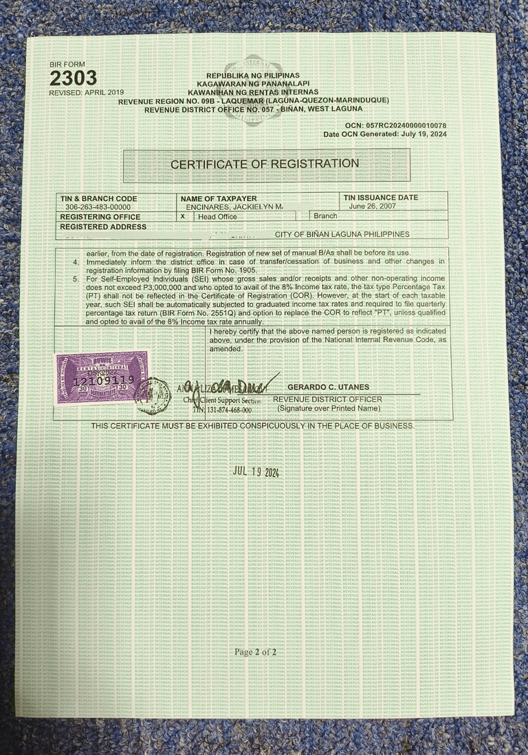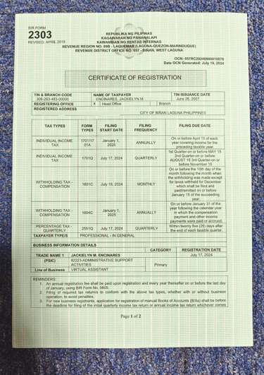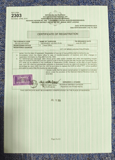 Jackie's business is registered to the Bureau of Internal Revenue