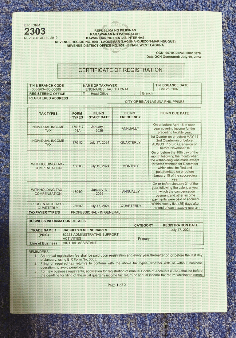 and can issue official receipts to the clients who availed her Virtual Assistance Services.