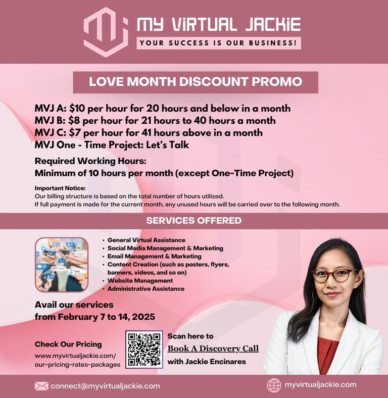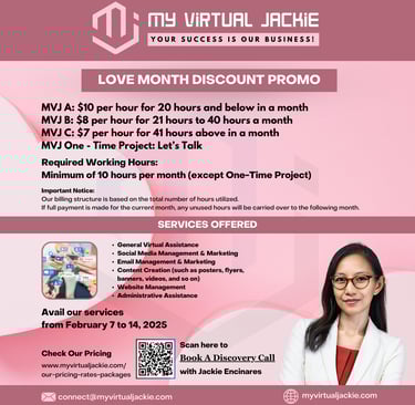 Love is in the air this February, and we're excited to offer you special discounts on our premium Virtual Assistance Services! From February 7 to 14, 2025, enjoy our exceptional services at rates starting from just $7 to $10 per hour. 💘